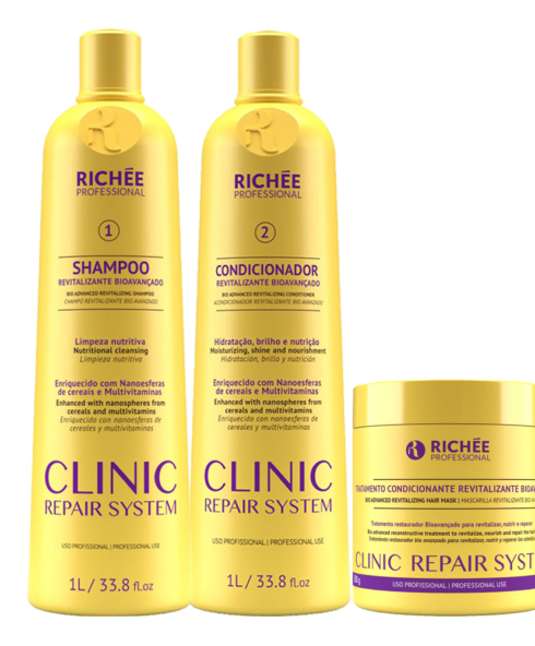 La línea Clinic Repair System para cabellos apagados, encrespados y quebradizos proporciona una limpieza suave al mismo tiempo que devuelve los niveles de hidratación profunda y fuerza a las hebras, recuperando todo tipo de cabello. Ayuda a revitalizar la fibra capilar, dejando el cabello totalmente hidratado, suave y con brillo intenso.